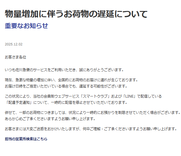 佐川急便は12月2日、「現在、急激な物量の増加に伴い、全国的にお荷物のお届けに遅れが生じております。