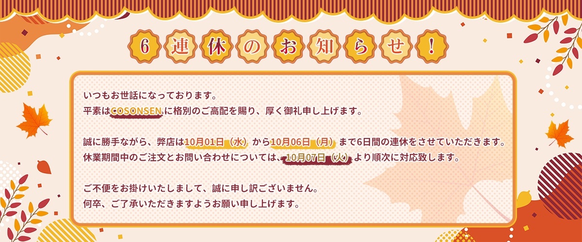 誠に勝手ながら、弊店は2025年10月1日(水)~2025年10月6日(月)6日間の連休をさせていただきます。