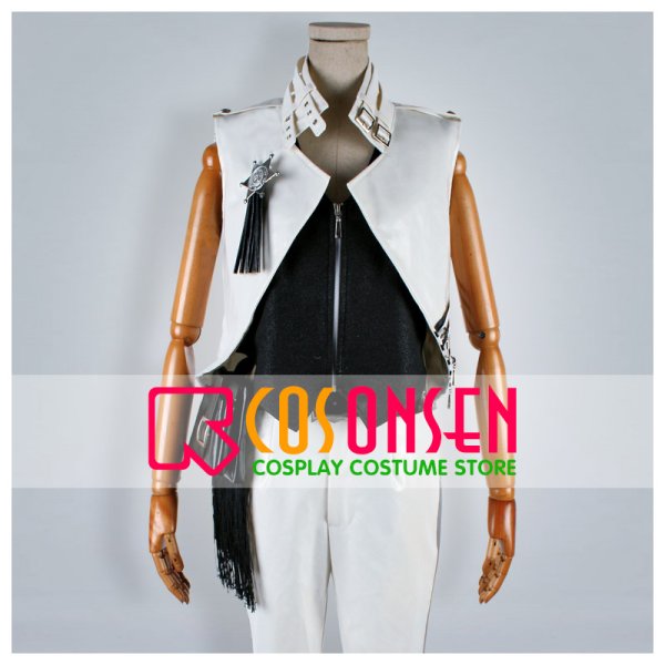 【コート】合皮生地で作られた白いコートです。右胸にはクラウンと六芒星の飾りを配置して、肩の後ろにはリベットとチェーンが付いて、後ろの方はやや長いです。デザイン感があふれて、辻魁斗の魅力さをうまく表現します。