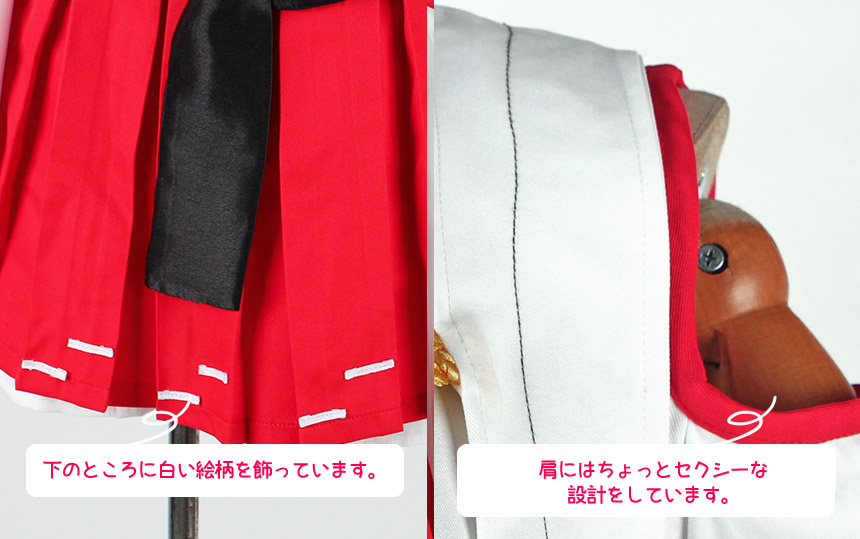 【上着】白を基調したポリ混紡で製作しました。襟と袖に赤いラインが入り、ちょっと和服のような設計をしています。正面の特殊なデザインは原作を完壁に再現しました。