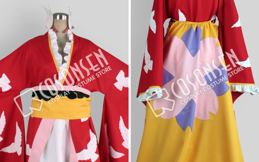 赤を基調したポリ混紡生地にて製作します。和服様式で、襟周りに白いフリルが飾っています。衣装に白い鳥模様な図案があり、注目します。ちょっと長くてお姫様な感じが伝わてきます。