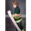 濃い緑を基調したポリ混紡生地にて製作します。立て襟が付き、服に本物の消防制服のラインが貼って、かっこいいです。紐は銀色を基調した合皮生地にて製作します。消防士の感じがありますよね。服は綿入りでふわふわした感じです。