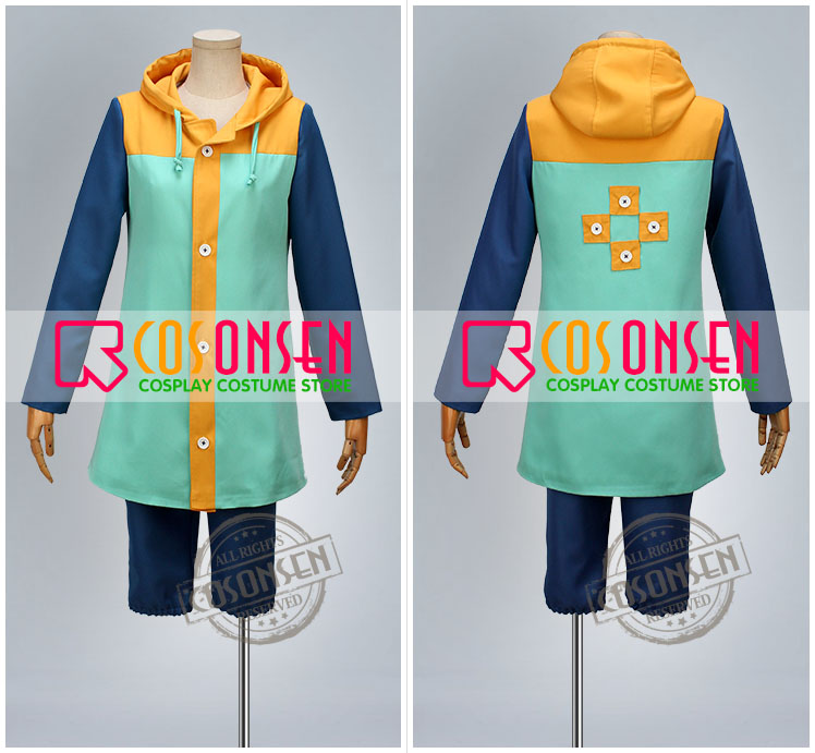 紺色、黄色と緑三色を基調したポリ混紡生地と厚手ポリ混紡生地にて製作します。袖の部分はポリ混紡生地製、他の部分は厚手ポリ混紡生地で製作されております。帽子も付き、背面にも四つの正方形の飾りがあって、元絵を完璧に再現しました。