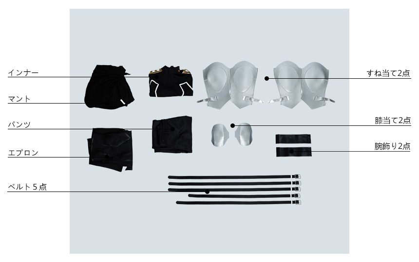 飾り物(エプロン、腕飾り、ベルト5点、すね当て2点、膝当て2点)も付属しています。