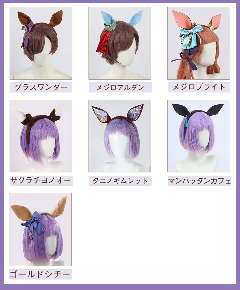 キャラクターにより髪飾りが違いますので、ご注文の際ぜひ備考欄にご希望のキャラクターを記入してください。ダイワスカーレットのティアラのみ追加料金1000円がかかります。ご了承ください。製作側の都合により追加料金が発生することがありますが、予めご了承ください。