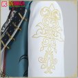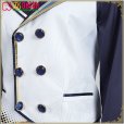 ポリエステルツイルで制作しています。白を基調として、両サイドにポケットが施されています。襟に金色と銀色の合皮で縁取りされていて、華やかに見せています。