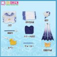 上着、スクール水着、飾り物(付け袖2点、帽子、蝶結び2点、腿飾り、カバン、チョーカー)