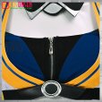 ポリエステルギャバで製作しています。白色とオレンジ色を基調として、胸先にベルトを飾り、原作を再現します。