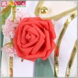 ポリエステルギャバで製作しています。緑を基調として、裾に綺麗な花柄がプリントされたラウンドネックのベストで、痩せるに見えます。