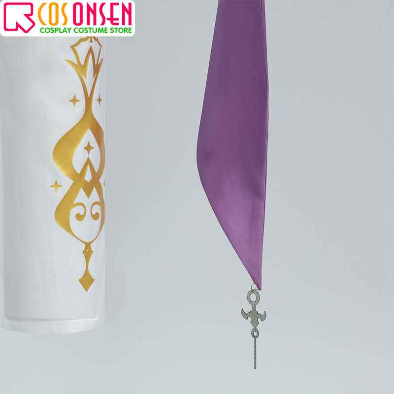 ポリエステルギャバで制作しています。白を基調として、左肩と後ろに綺麗な飾り布が飾ってあり、胸元に紫色のバラ柄がプリントされて再現度が高いです。