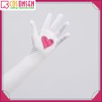 サテンで製作しています。白を基調として、右側はノースリーブで、左側は半袖で、ユニークなデザインで印象的です。スカート部分は多重プリーツスカートのデザインで、裾に白いバラが飾ってあり、超可愛いです。
