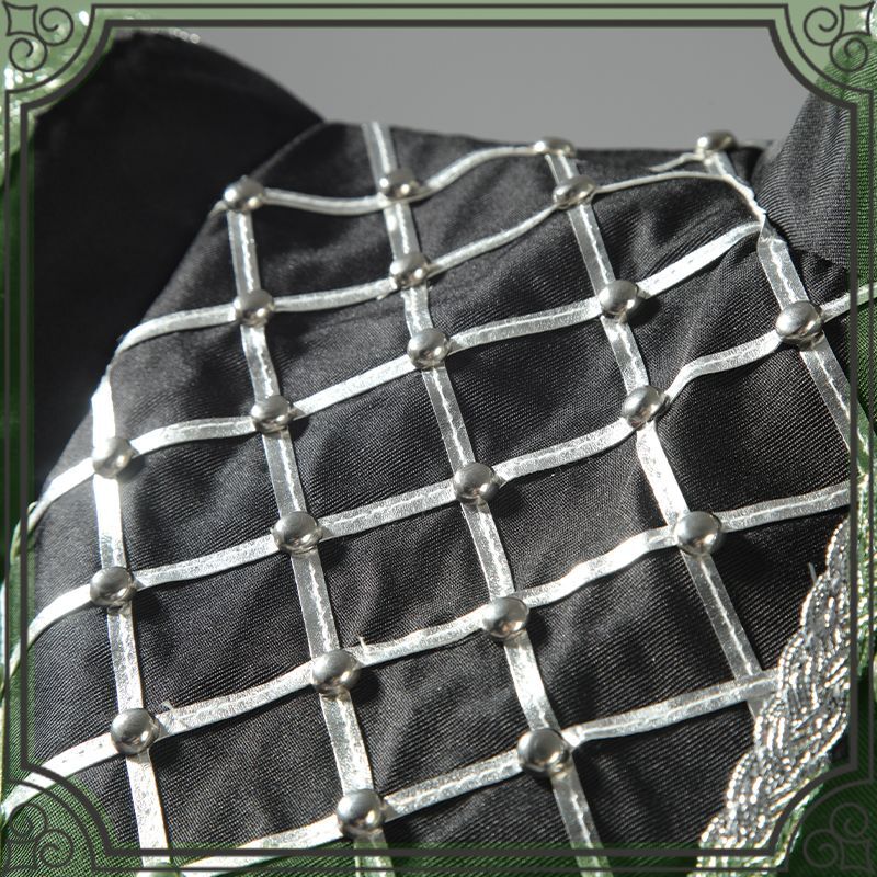 主にポリエステルギャバとジャガード生地で製作しています。黒を緑を基調として、襟と袖口と裾にフリルが施されて綺麗に見えます。
