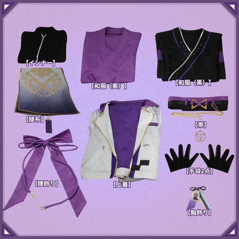 上着、和服(黒)、和服(紫)、インナー、飾り物(胸飾り、手袋2点、帯、腰布、腰飾り)