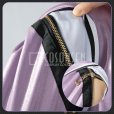 光沢布で製作しています。肩にファスナーがついて個性的です。両サイドに本物のポケットが施されてとても便利です。