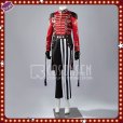 サテンで製作しています。赤と黒を基調として、正面に菱形の柄がプリントされて再現度が高いです。フロントと両袖に金色のグリッターで柄が施されて華やかです。