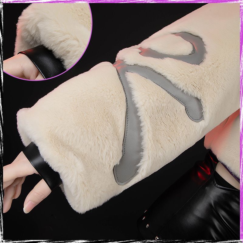 フェイクラビットファーで製作しています。ふわふわな素材で、丈感は少し短めにして可愛く演出できます。襟に黒い縁取りが施されて原作を忠実に再現しました。