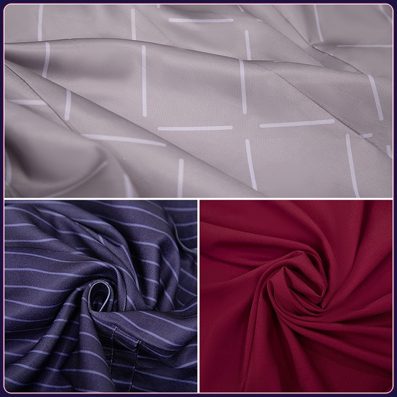 ポリエステルで製作しています。縦ストライプがにプリントされて、真っ直ぐなシルエットで、脚長効果を発揮しています。