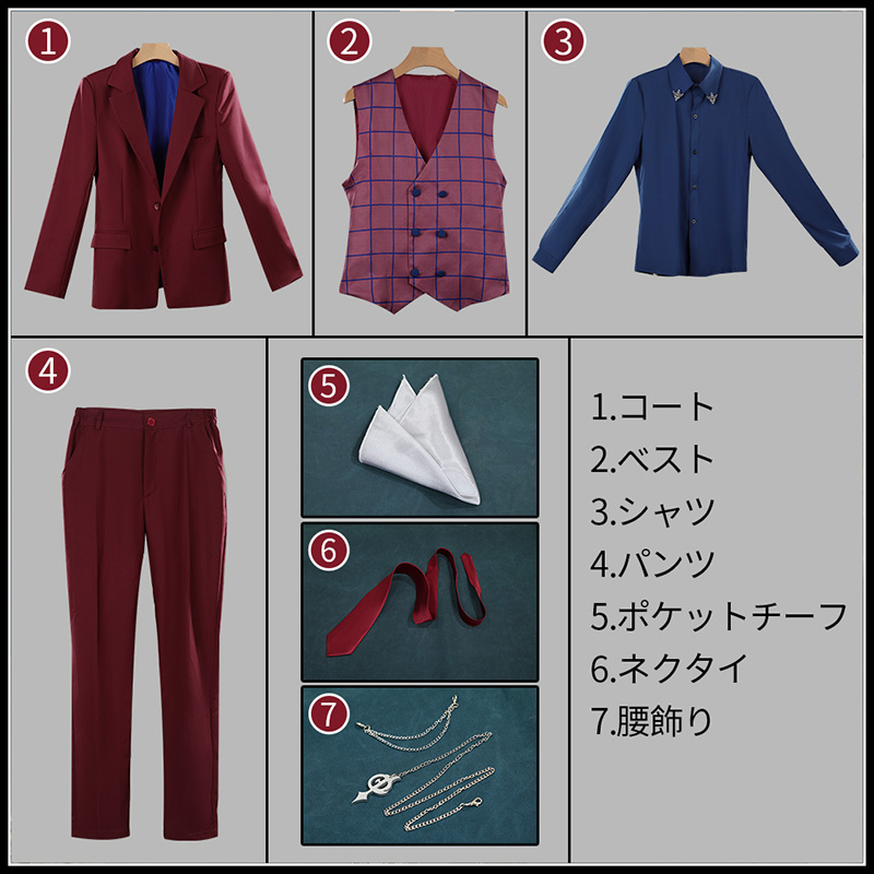 コート、ベスト、シャツ、パンツ、飾り物(パケットチーフ、ネクタイ、腰飾り)