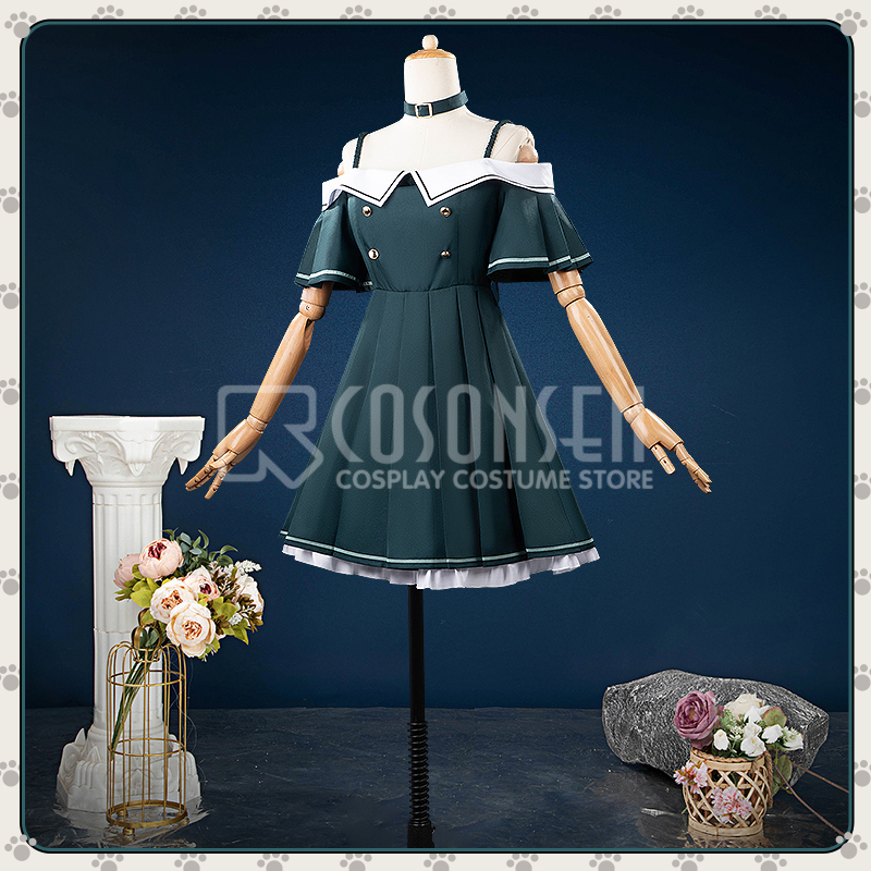 ポリエステルギャバで製作しています。セーラースタイルの金ボタンと白い襟がレトロな制服の雰囲気を醸し出し、オフショルダーデザインが軽やかさを際立たせます。落ち着いた色合いの中に少女らしい魅力が溶け込み、春夏にぴったりの一着です。