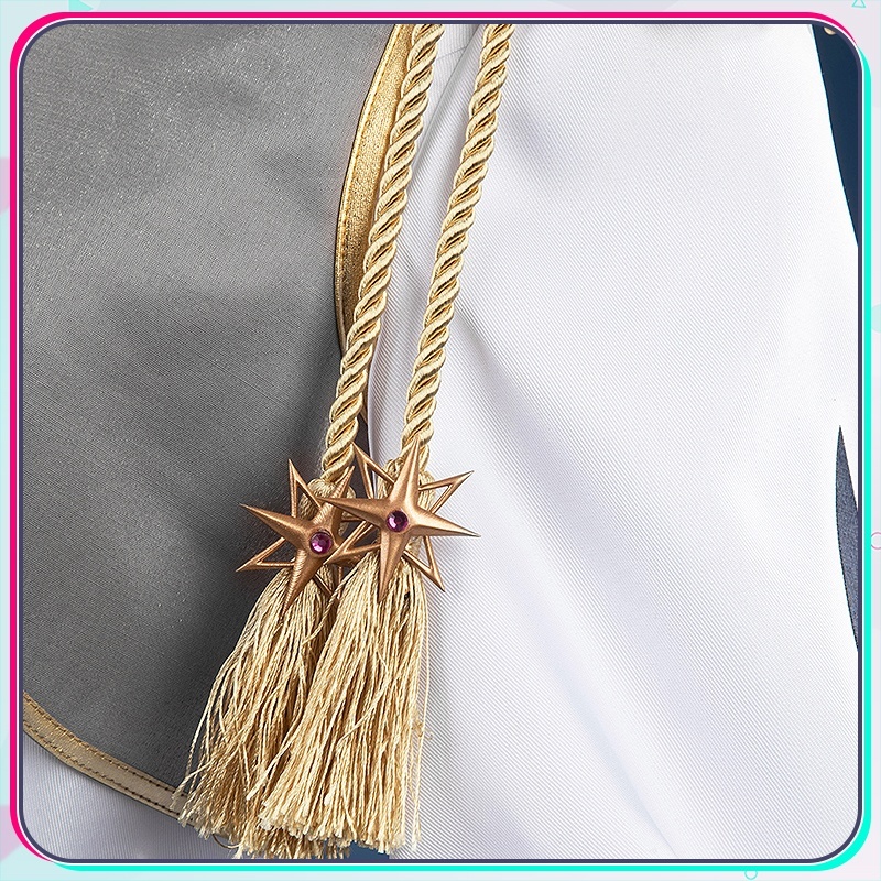 光沢布で製作しています。軍装風デザインが特徴的で、右肩には金色のフリンジ付き肩章が垂れ下がり、穏やかな威勢を添える。