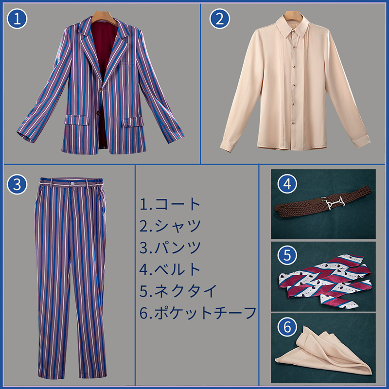 コート、シャツ、パンツ、ベルト、ネクタイ、ポケットチーフ