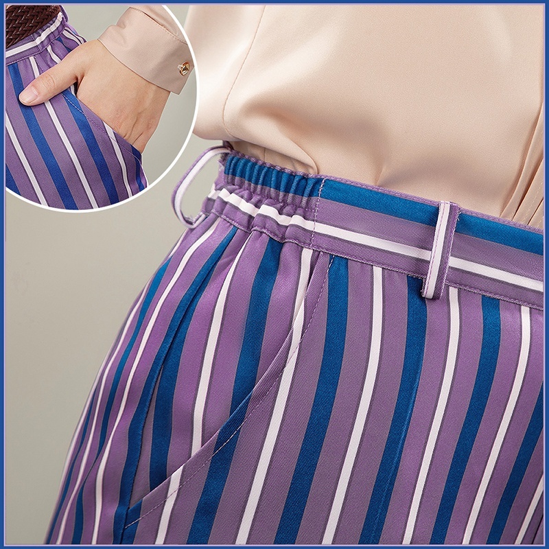 ポリエステルで製作しています。紫と青、白を組み合わせた縦縞生地を使用し、ビジュアルに強いアクセントを加えています。裏面には赤みがかったバーガンディ色の裏地が施されます。