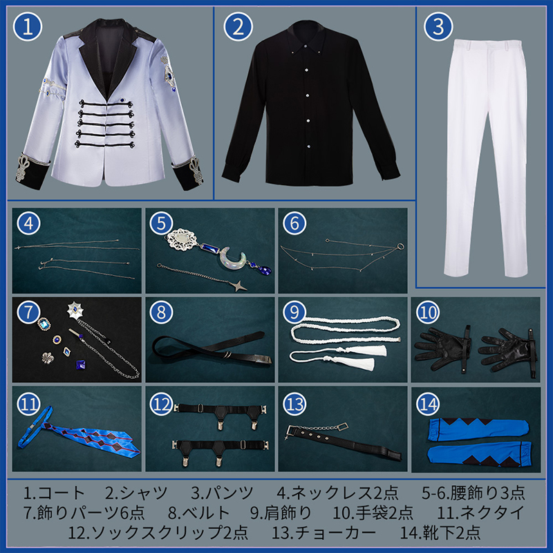 コート、シャツ、パンツ、飾り物(ネックレス2点、腰飾り3点、飾りパーツ6点、ベルト、肩飾り、手袋2点、ネクタイ、ソックスクルップ2点、チョーカー、靴下2点)