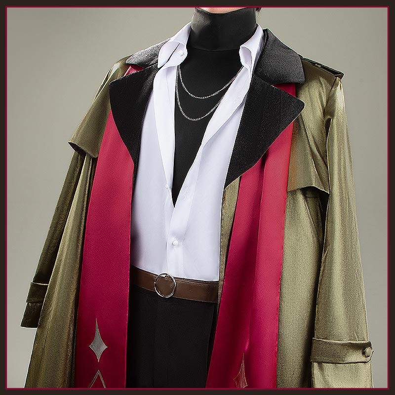 コート、シャツ、インナー、パンツ、飾り物(ベルト、手袋2点、ネックレス、スカーフ)