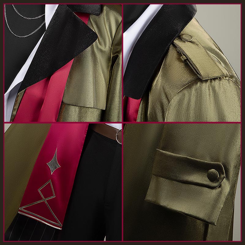 光沢布で製作しています。生地は厚みのあるサテン調で、光の角度によって妖しく輝きます。襟は黒地で切り替えられ、裏地と内側のスカーフ部分は鮮烈なワインレッド。背面には深いセンターベント+ベルトと、クラシックな軍服トレンチをベースにしながらも劇的にドラマティックに仕立てたデザインです。