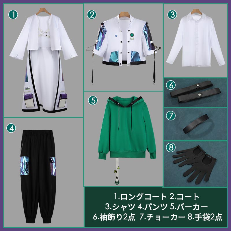 ロングコート、コート、シャツ、パーカー、パンツ、飾り物(袖飾り2点、チョーカー、手袋2点)