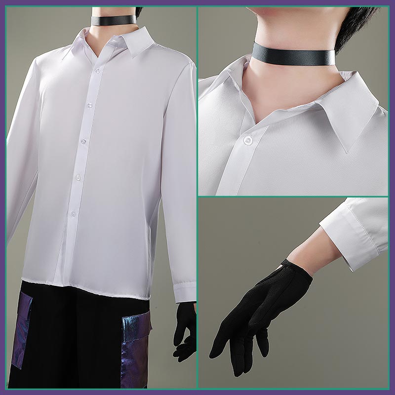 ウェディングサテンで製作しています。光沢のあるホログラム生地が動くたびに虹色に輝く未来感MAXのデザインで、「MURA」ワッペンや紫のポケット、胸元のXベルトがクールさを加速、細部まで完璧に再現。