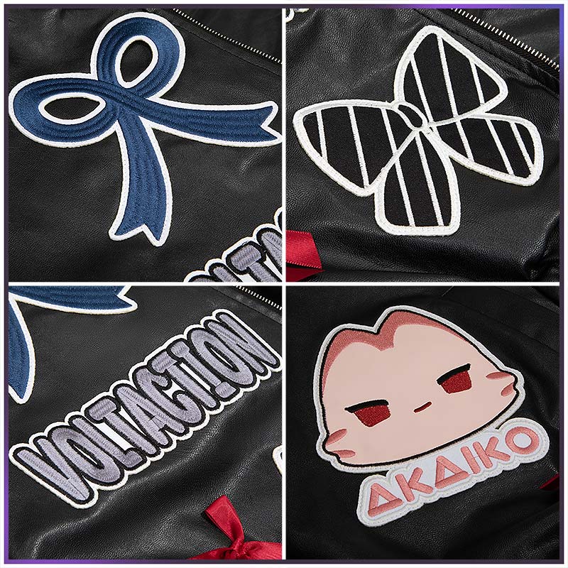 フェイクレザーで製作しています。黒の合皮素材を基調としたショート丈のコートです、部分は白い生地にオーロラ調の光沢ラインが入り、赤いリボンが複数箇所に可愛らしく配置されています。