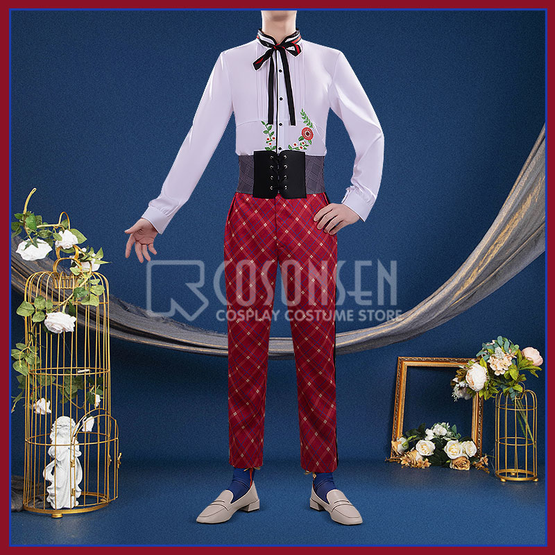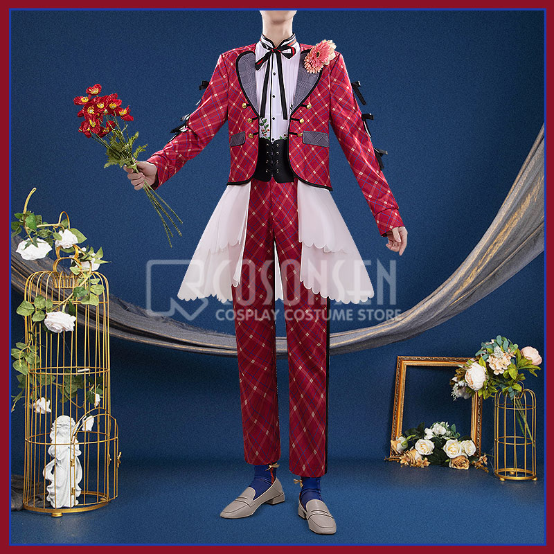 ポリエステルで製作しています。赤を基調としたチェック柄で、胸元と袖には金色の大きなボタンが配され、袖には複数の黒いサテンリボンが等間隔に結ばれて装飾されている。全体的に華やかでアイドルの派手さと可愛らしさを兼ね備えたデザインです。