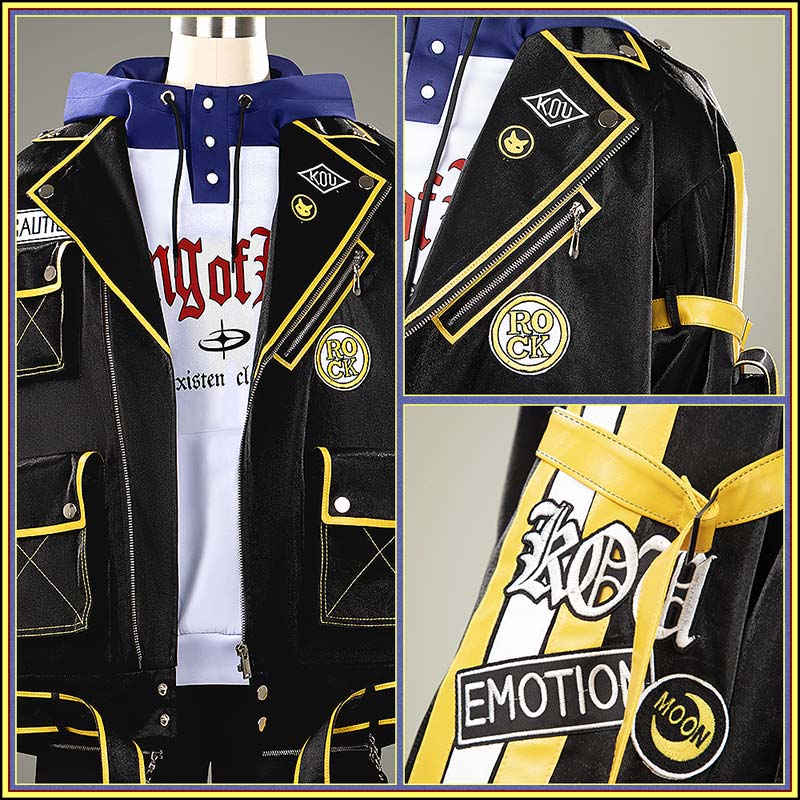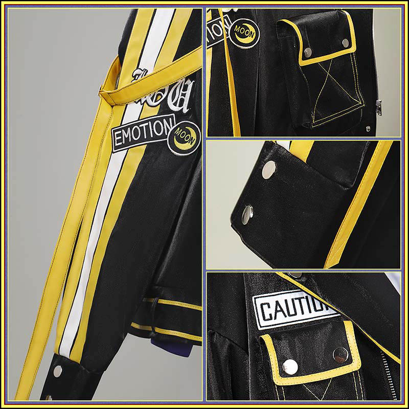 光沢布で製作しています。黒を基調とした、黄色の縁取りとステッチがアクセント。複数のポケットとベルトが配置され、袖に白と黄色のストライプが入り、機能的でロックテイストの強いスタイル。
