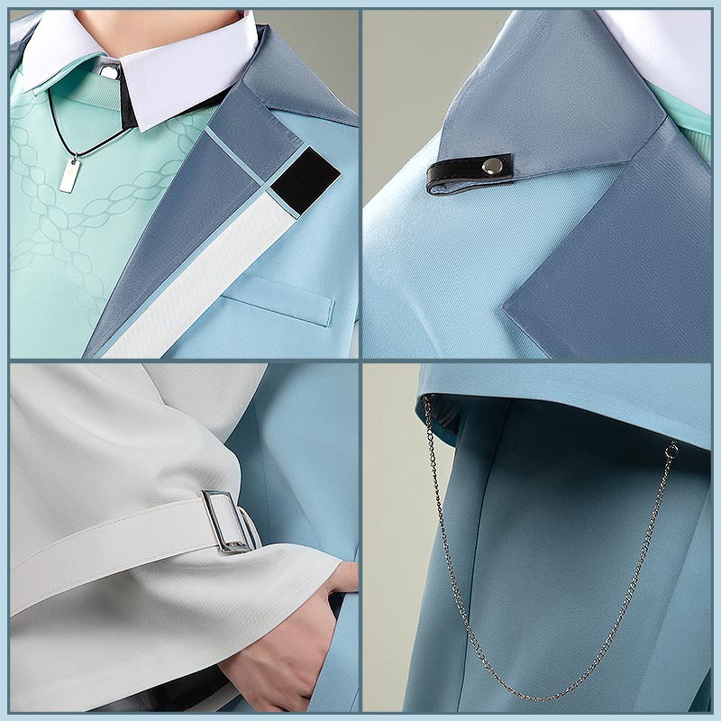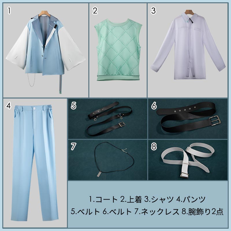 コート、上着、シャツ、パンツ、飾り物(ベルト2点、ネックレス、腕飾り2点)