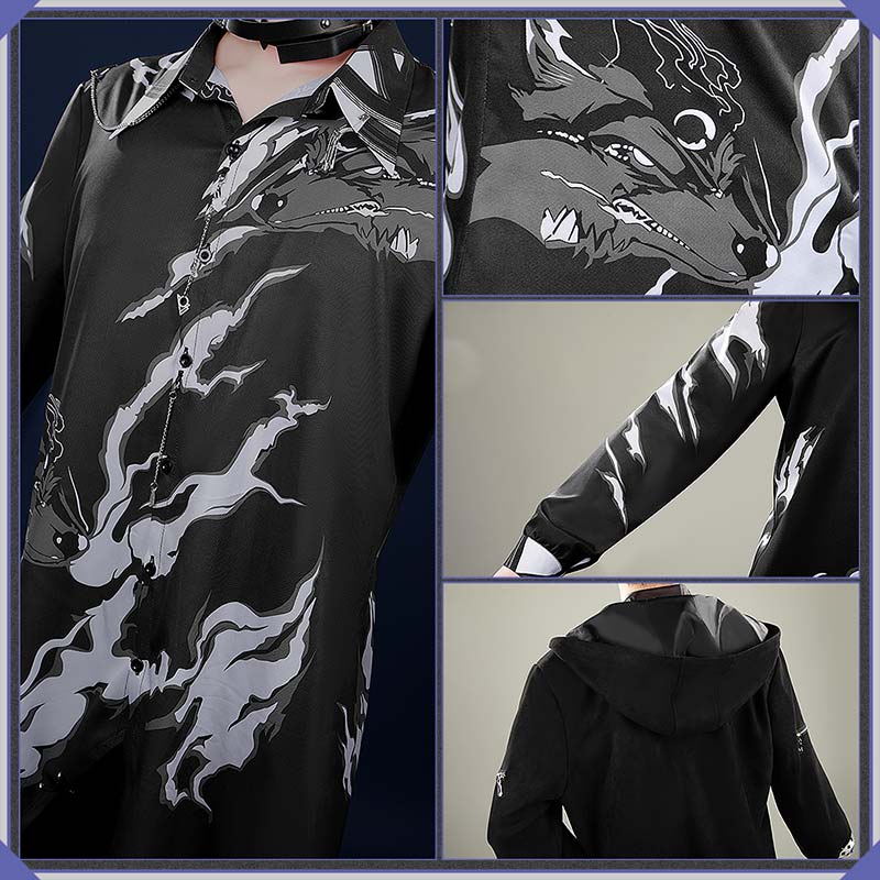 シャツ生地で製作しています。「狼&炎」プリントが大胆に配置され、垂れ感の良い素材がスタイルを柔らかく演出します、単体でもレイヤードでも使えます。