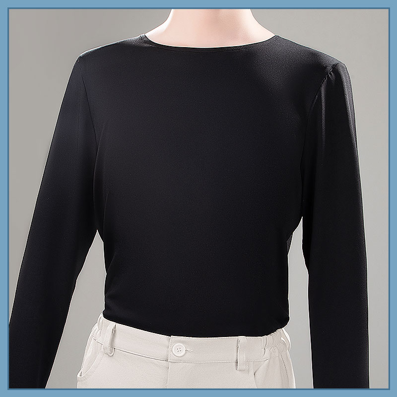 ニット生地で製作しています。首元はラウンドネックで、袖はタイトフィットながら動きやすいデザイン。