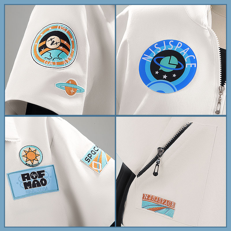 デニム生地で製作しています。フロントには中央にジッパーが配置され、胸元や袖に複数のカラフルなパッチが施されています。サイドポケットにジッパーが付き、裾にベルトが垂れ下がるデザインがアクセントとなっています。