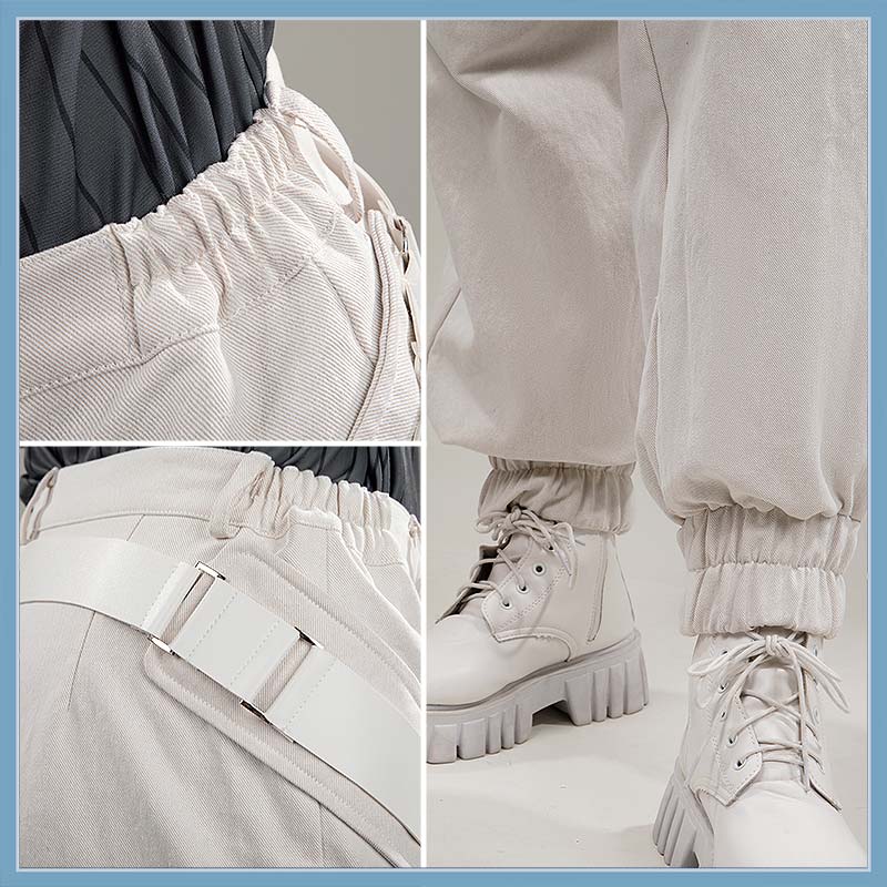 デニム生地で製作しています。腰回りに白いサスペンダー風のストラップが付き、腿部分には黒いバンドと円形のメーターが配置され、SF的なガジェット感を強調しています。