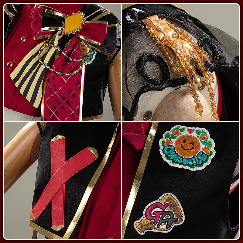 光沢布で製作しています。黒地にゴールドの縁取りが特徴的で、背面にはゴールド刺繍が施されています。前面赤い「X」デザインの装飾、「OHAMILE」の笑顔アップリケ、「GA」ロゴの布切れなどが配置され、ボタン付きの大きなリボンやチェーンがアクセントを付けています。透視のメッシュ素材に金のビーズ装飾を施した肩や袖の部分は、繊細さと輝きを加え、全体の高級感を引き上げています。