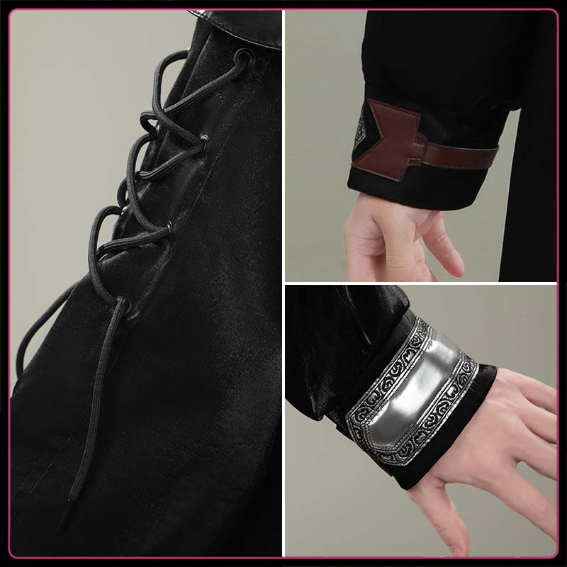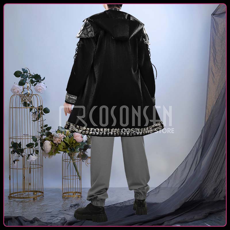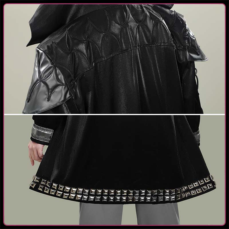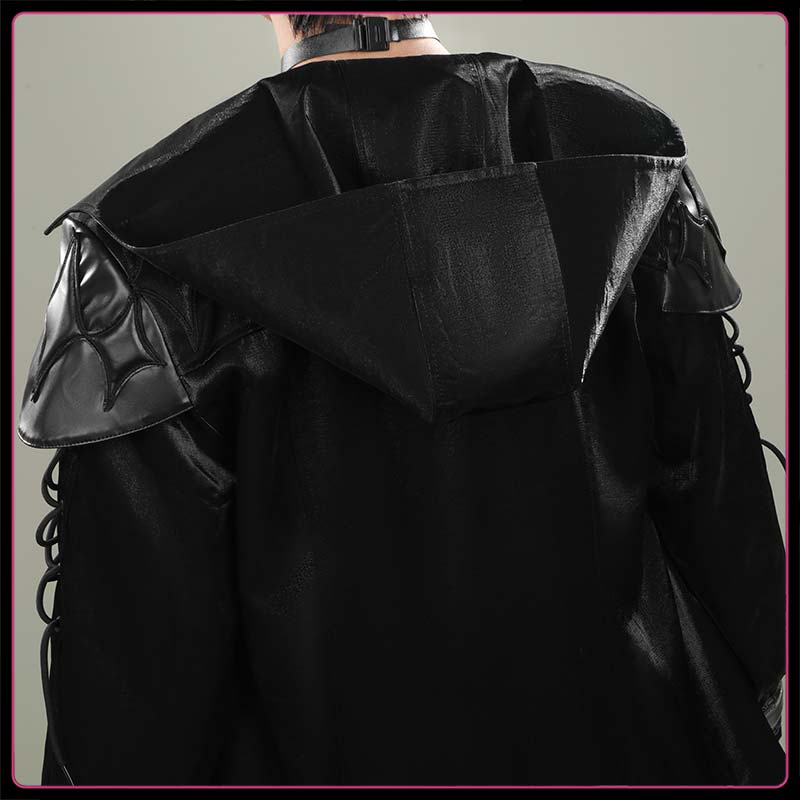 光沢布で製作しています。ロングコートで、ゴシックでダークな雰囲気が特徴で、袖にはレースアップの紐、裾周りや縁取りにシルバーのスタッズが並び、全体的にロックやパンク調のエッジの効いたデザインです。