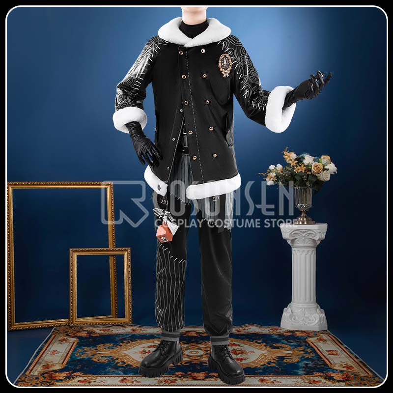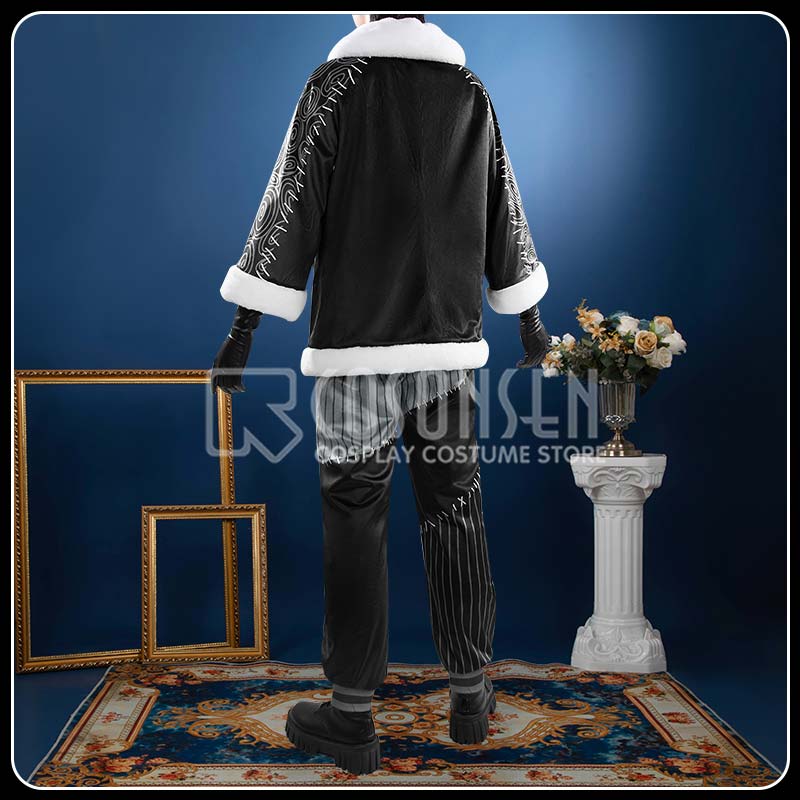 ハリ感のある黒地の生地と、襟・袖口に施したふわふわとした白いフェイクファーが丁寧に縫い合わされ、質感の美しい対比を生み出しています。左胸にはメタル製のゴールドカラー・クリスマスエンブレムを配置。ゴールドのボタンと袖口のプリントが、細部にわたる上品さをさらに引き立てています。