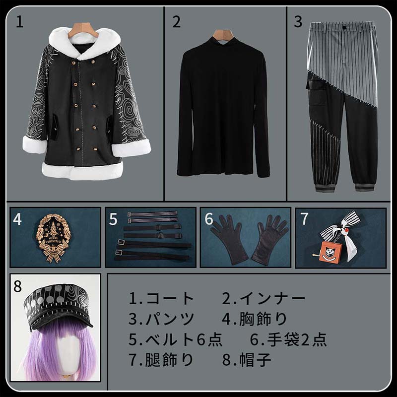 コート、セーター、パンツ、飾り物(胸飾り、ベルト6点、手袋2点、腿飾り、帽子)