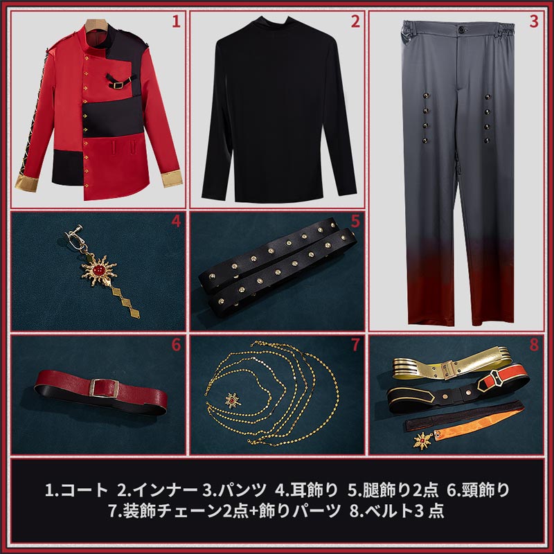 コート、インナー、パンツ、飾り物(耳飾り、腿飾り2点、頸飾り、装飾チェーン2点、飾りパーツ、ベルト3点)