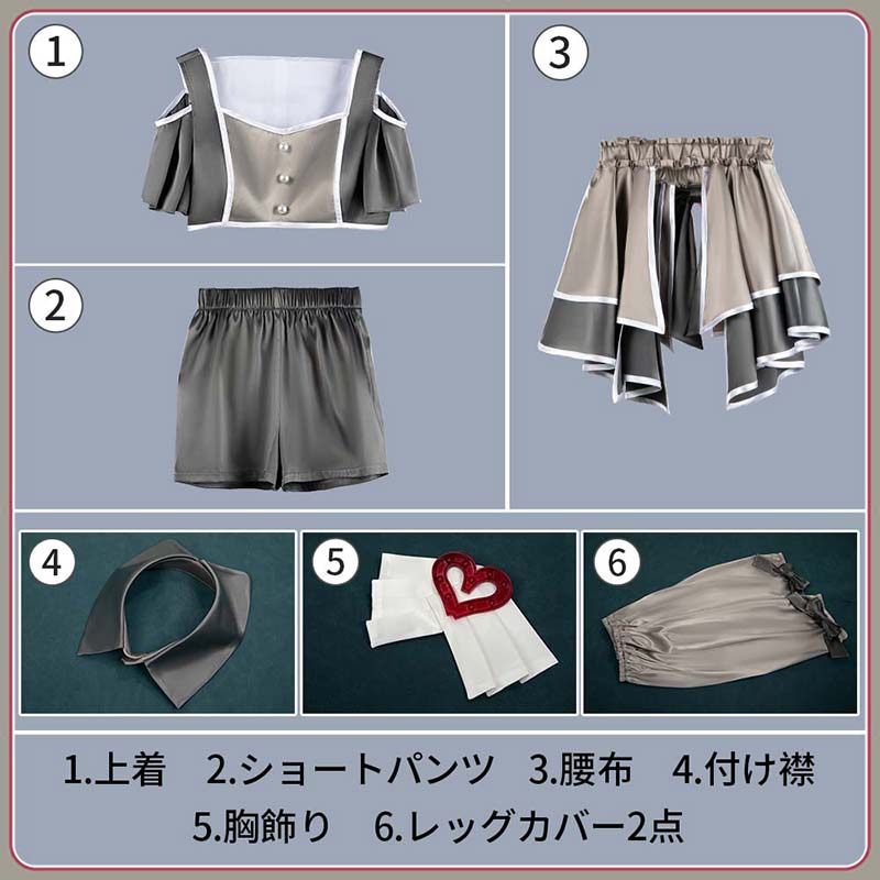 上着、ショートパンツ、腰布、飾りパーツ(胸飾り、つけ襟、レッグカバー2点)