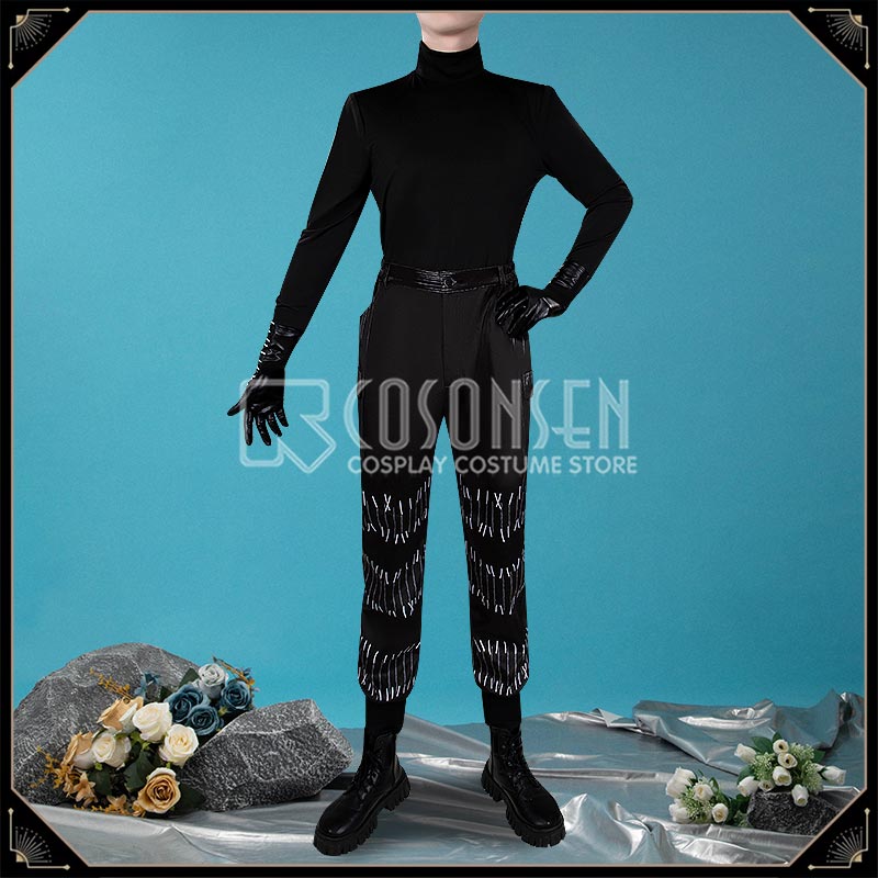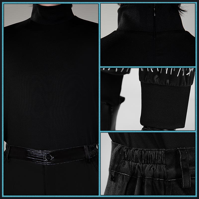 ベロア生地で製作しています。黒いパンツに入った白いストライプ模様は、ウエストから裾までスムーズに伸びています。ストライプのプリントは輪郭が鮮明で、高いプリント技術を示しています。衣装の個性と芸術性を大きく引き立てています。ウエストにはゴールドのボタンがアクセントとして付き、実用的なサイドポケットとバックポケットも備えています。