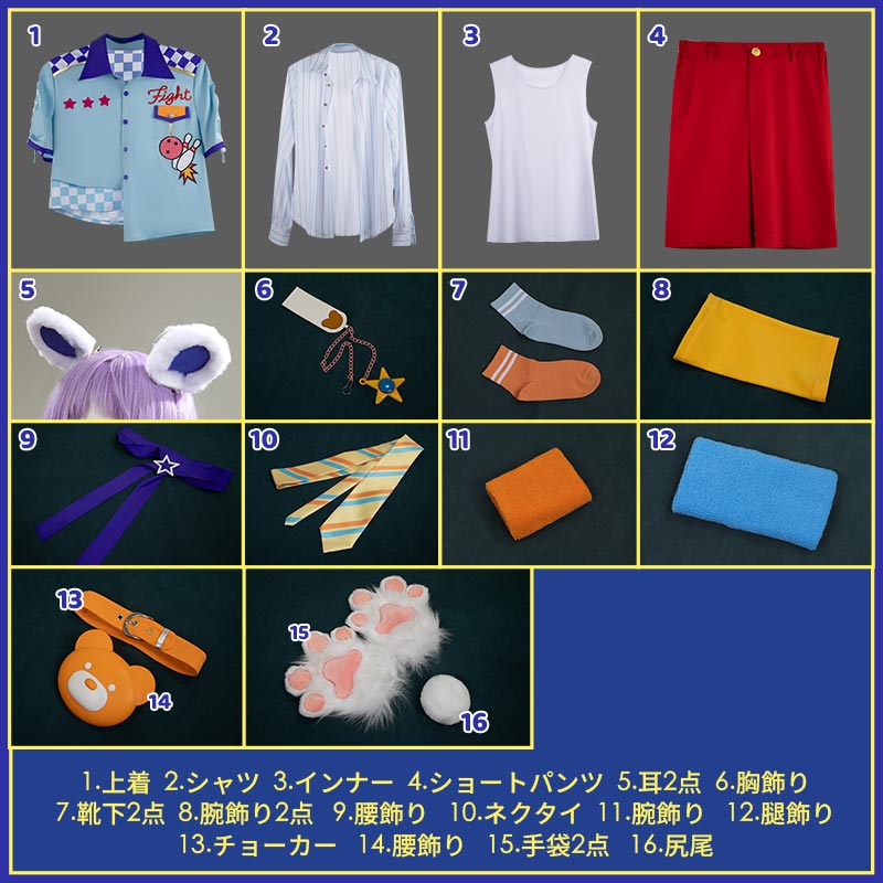上着、シャツ、インナー、ショートパンツ、飾り物(耳2点、胸飾り、靴下2点、腕飾り2点、腰飾り2点、ネクタイ、腕飾り、腿飾り、チョーカー、手袋2点、尻尾)