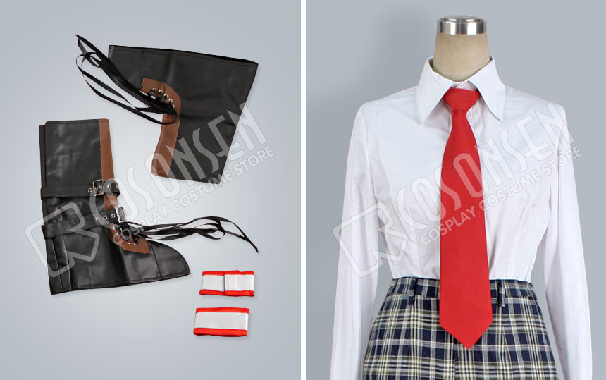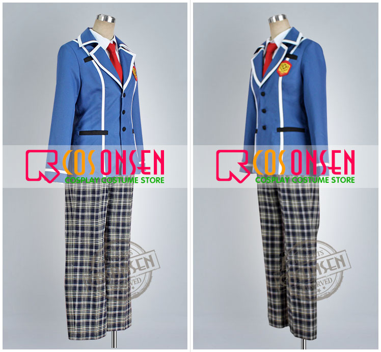■ジャンル:大人気なアニメ・テイルズオブヴェスペリア ユーリ 学園編 頼れる上級生COSONSEN ■セット内容:計6点 ジャケット、シャツ、ズボン、ネクタイ、アクセサリー ■素材:ポリ混紡生地、シャツ生地 ■商品詳細: ▼ジャケット 青を基調したポリ混紡生地にて製作します。左の胸元に校章が付き、縁取りにある白いラインと正面の黒いボタンが目立ちます。 ▼シャツ 白いシャツ専用生地にて製作します。普段にも着られる心地よい一枚です。 ▼ズボン ポリ混紡生地にて製作します。チェック柄がお洒落です。 ▼ネクタイ 赤色のネクタイが鮮やかな胸元を演出します。 ▼アクセサリー ブーツカバーとリストバンド