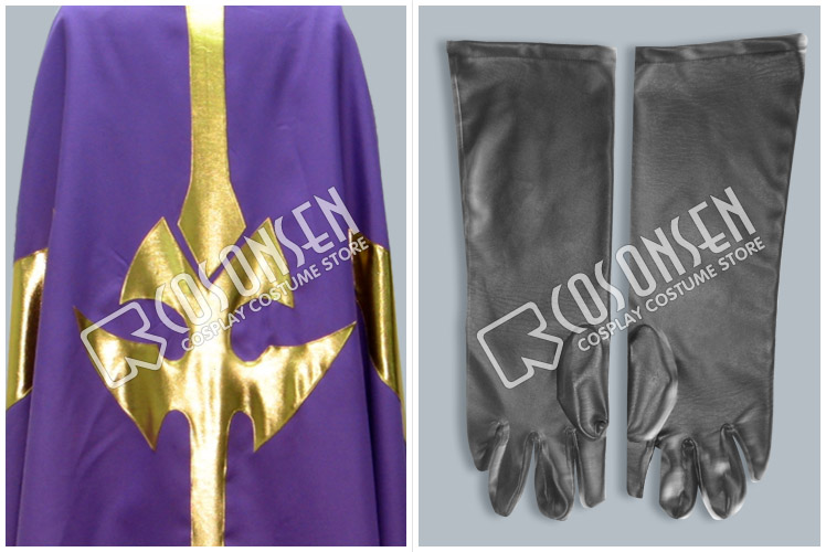 [マント]紫を基調したポリ混紡生地で製作いたしました。襟部分は硬めの芯を入れていますので、しっかり立たせることが出来ます。金色の紋様は合皮生地で製作いたしました。