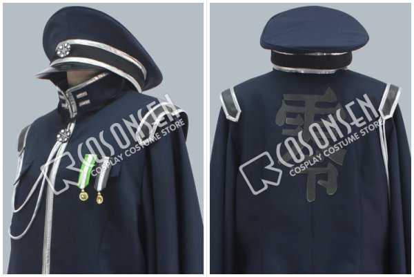 「上着」ネイビーを基調したポリ混紡生地で製作します。華やかな袖はこの衣装の特徴です。背中に「零」ロゴも付きます。左胸の軍章は原作とそっくりです。